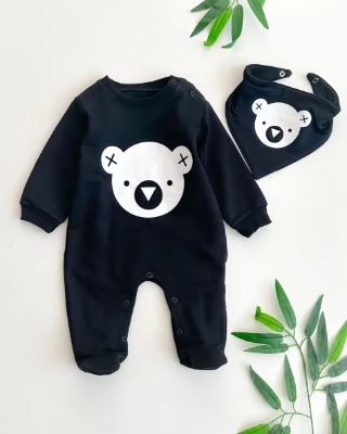 Ayı ve geometrik şekiller baskılı alttan ve omuzdan çıtçıtlı ayaklı fularlı 2 parça takım