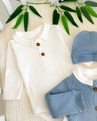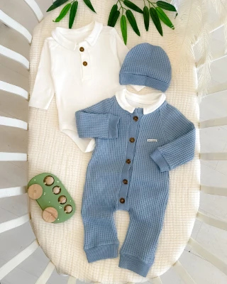 Boydan ahşap düğme detay gofret kumaş mevsimlik çıtçıt badi tulum set Meva Baby Bebek ve Çocuk Giyim | Meva Baby | mevababykids.com