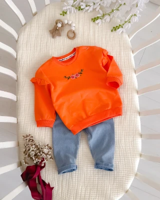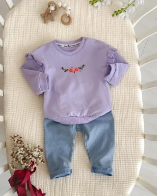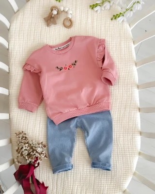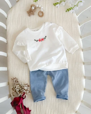 Çiçek ve Dal nakışlı omuzları fırfır detaylı kot pantolonlu mevsimlik 2 parça takım