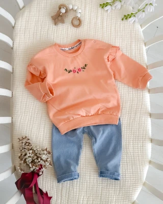 • Çiçek ve Dal nakışlı omuzları fırfır detaylı kot pantolonlu mevsimlik 2 parça takım