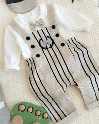 Ayıcık nakışlı kasketli bayramlık 4lü erkek bebe salopet