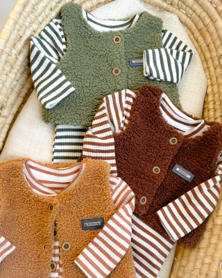 Kürk yelekli ahşap düğme detaylı alttan çıtçıtlı çizgili ayaklı 2 parça tulum set Meva Baby Bebek ve Çocuk Giyim | Meva Baby | mevababykids.com
