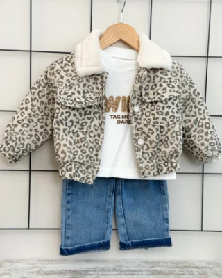 • Leopar desenli astarlı kot pantolonlu premium 3lü kız bebe takım