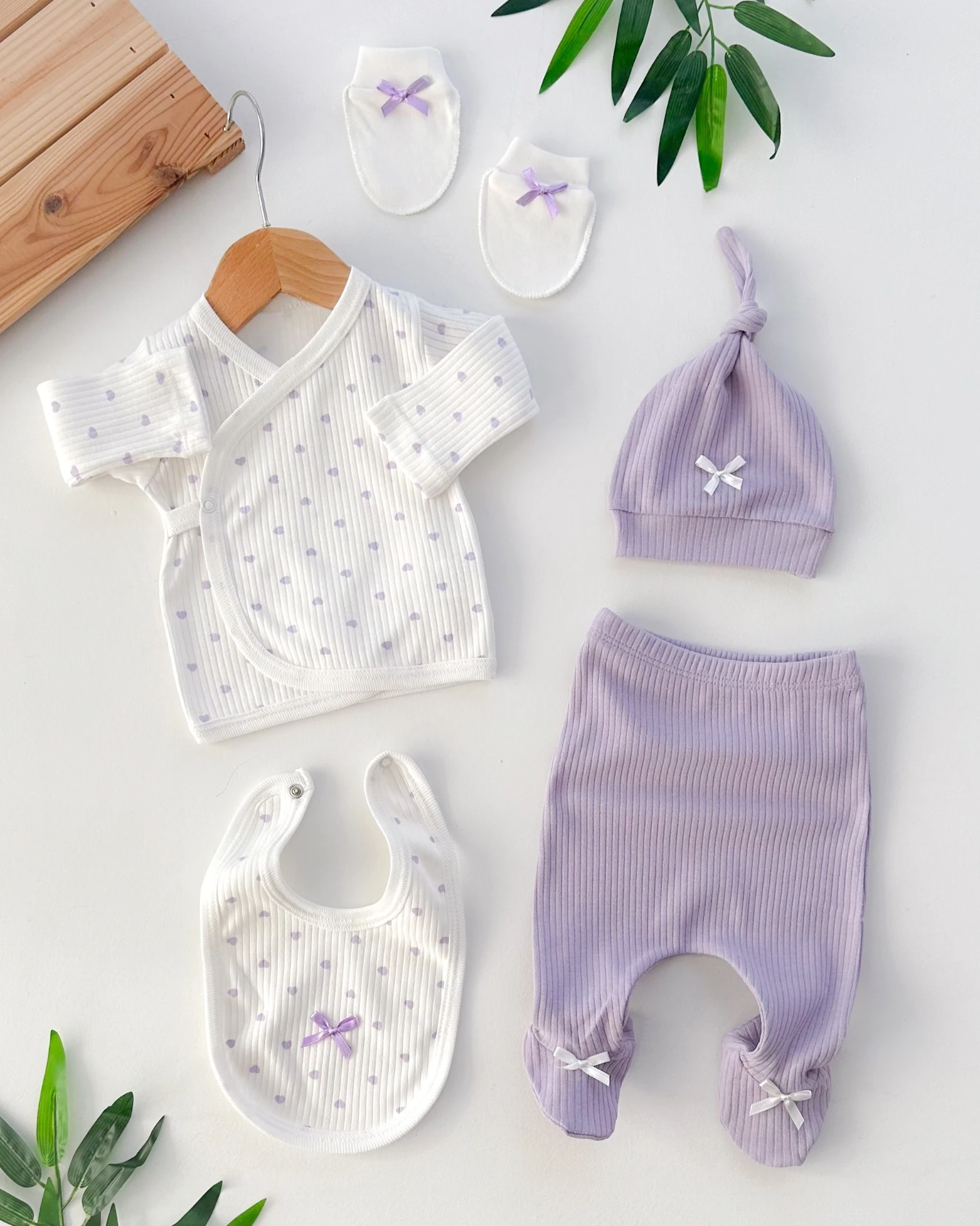 Minik kalp desen fiyon detaylı mevsimlik yenidoğan 5li set Meva Baby Bebek ve Çocuk Giyim | Meva Baby | mevababykids.com