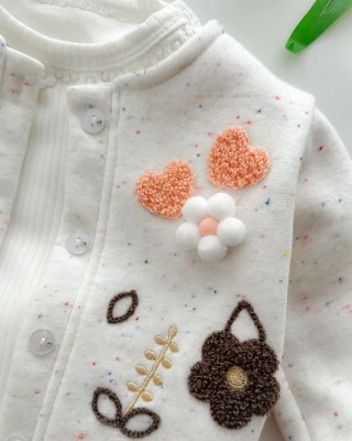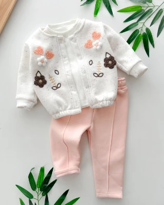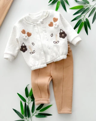Papatya çiçek kabartmalı taşlı düğme detaylı beli büzgü hırkalı kışlık 3 parça takım Meva Baby Bebek ve Çocuk Giyim | Meva Baby | mevababykids.com