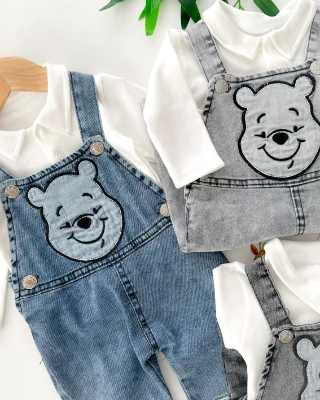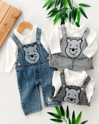 Pooh my first friend nakışlı gömlek yaka badili 2 parça salopet set Meva Baby Bebek ve Çocuk Giyim | Meva Baby | mevababykids.com