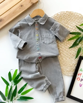 • Renkli sayılar nakışlı önden çıtçıt düğmeli mevsimlik kot kumaş 2 parça takım