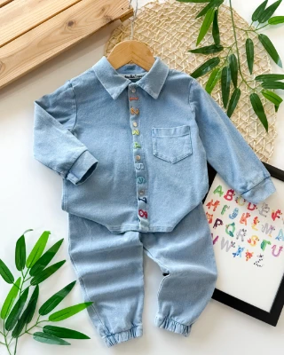 Renkli sayılar nakışlı önden çıtçıt düğmeli mevsimlik kot kumaş 2 parça takım