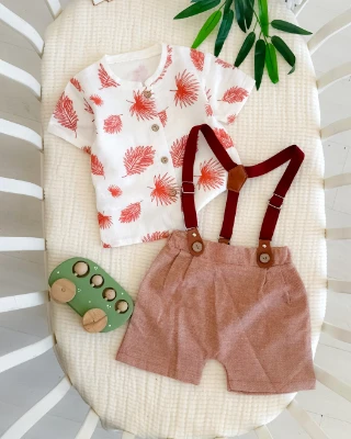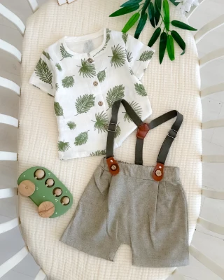 Renkli yapraklar baskılı çıkarılabilir askılı önden düğmeli yazlık 2 parça takım Meva Baby Bebek ve Çocuk Giyim | Meva Baby | mevababykids.com