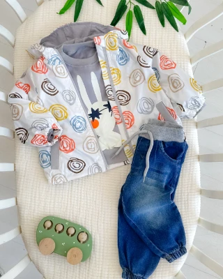 Şaşkın tavşan desenli yağmurluklu kot pantolonlü mevsimlik 3lü bebe takım