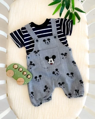 Sevimli farecik çizgili tişörtlü yazlık 2li salopet takım