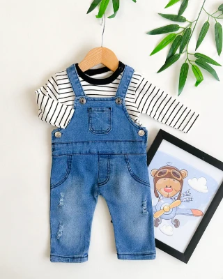 • Siyah çizgili sweatshirt önde cep detaylı erkek bebe kot salopet