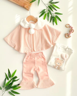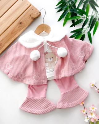 Süper cute nakışlı pelerinli yakası tüylü 3 parça takım Meva Baby Bebek ve Çocuk Giyim | Meva Baby | mevababykids.com