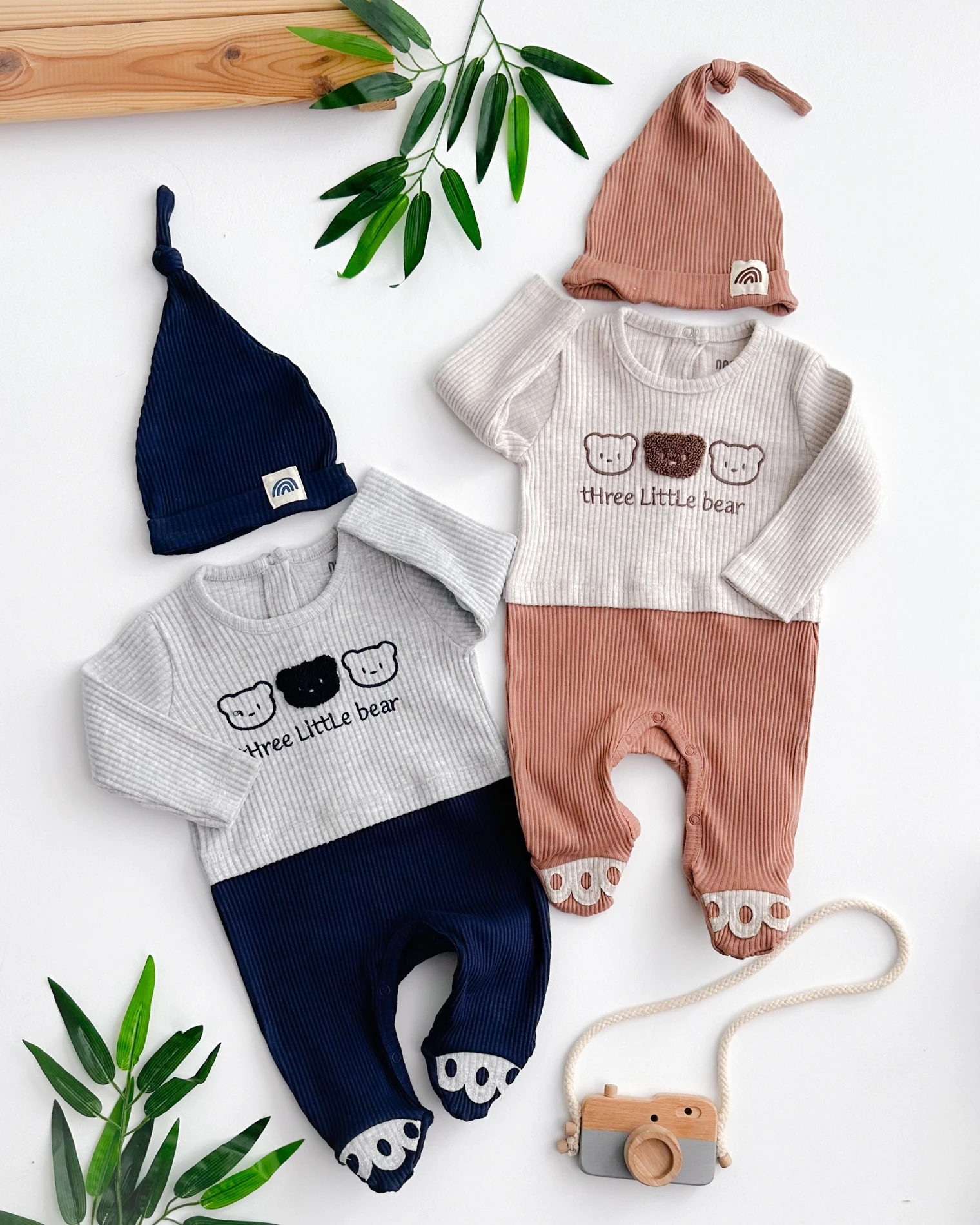 Three little bear arkadan ve alttan çıtçıtlı şapkalı mevsimlik 2li tulum set Meva Baby Bebek ve Çocuk Giyim | Meva Baby | mevababykids.com