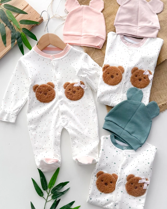 Bear hugs here nakışlı alttan çıtçıtlı fitilli kumaş badili mevsimlik kot salopet set