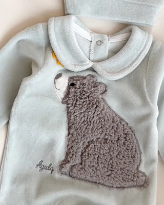 Tüylü boz ayı detaylı alttan ve arkadan çıtçıtlı ayaklı şapkalı kadife 2 parça tulum set Meva Baby Bebek ve Çocuk Giyim | Meva Baby | mevababykids.com