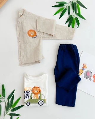 Wild free aslan baskılı cep detay gömlekli keten kumaş 3 parça takım Meva Baby Bebek ve Çocuk Giyim | Meva Baby | mevababykids.com