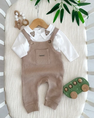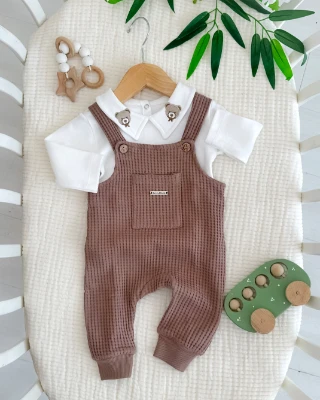• Yakada ayıcık nakış detaylı waffle salopetli 2li takım