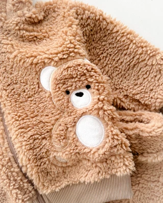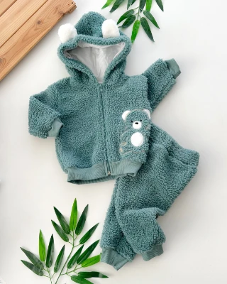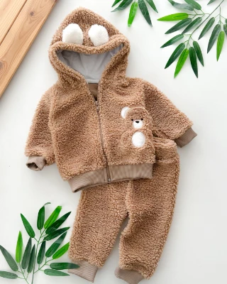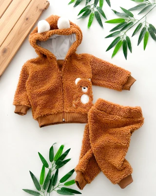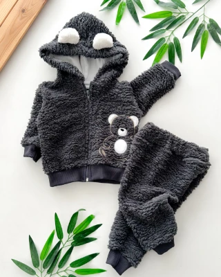 Yanda ayıcık nakışlık kapüşonlu fermuarlı welsoft kışlık 2 parça takım Meva Baby Bebek ve Çocuk Giyim | Meva Baby | mevababykids.com