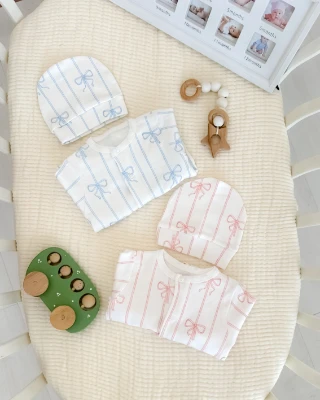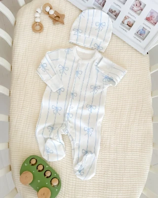 Zarif fiyonk desen boydan çıtçıtlı kendinden eldivenli mevsimlik tulum set Meva Baby Bebek ve Çocuk Giyim | Meva Baby | mevababykids.com
